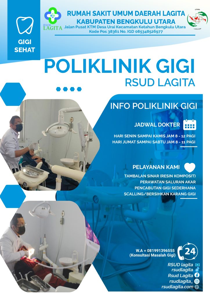 Sobat Lagita mau cabut gigi, bersihin karang gigi, atau ada masalah gigi nya, yuk ke Poliklinik Gigi Rsud Lagita, semua bisa dong, apalagi alat-alat nya lengkap banget. silahkan datang ya… terimakasih